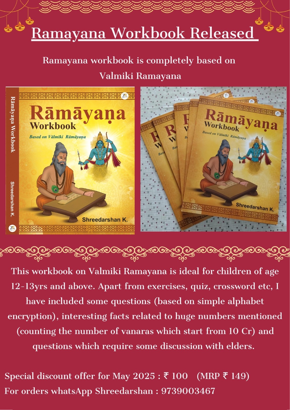I am extremely glad to inform you about the release of Ramayana Workbook which is completely based on Valmiki Ramayana. This workbook is ideal for children of age 12-13 and above.